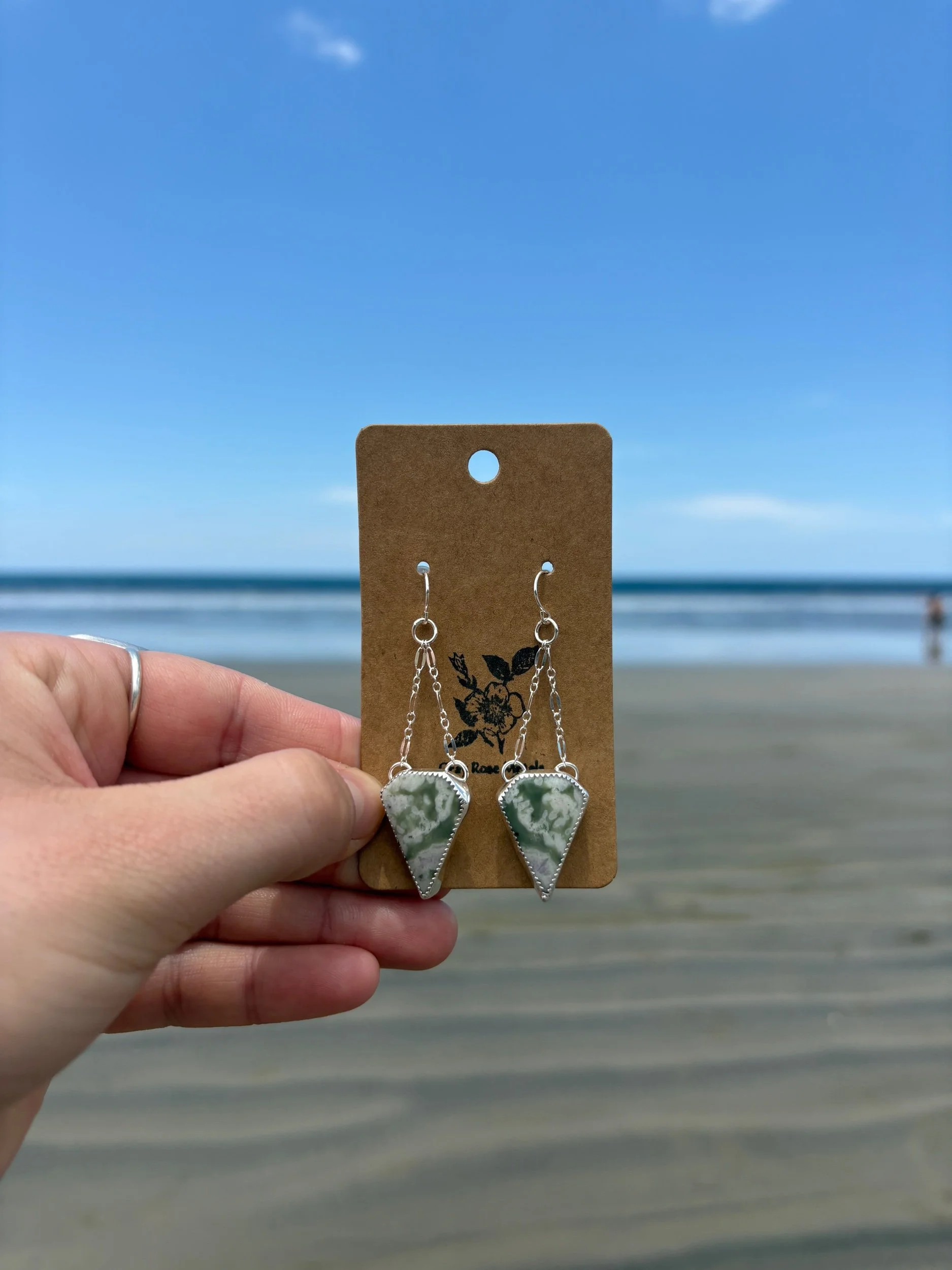 Image 1 of 1 Peace Jade Dangles $112.00 Made with sterling silver and natural peace jade Add To Cart Added! Made with sterling silver and natural peace jade