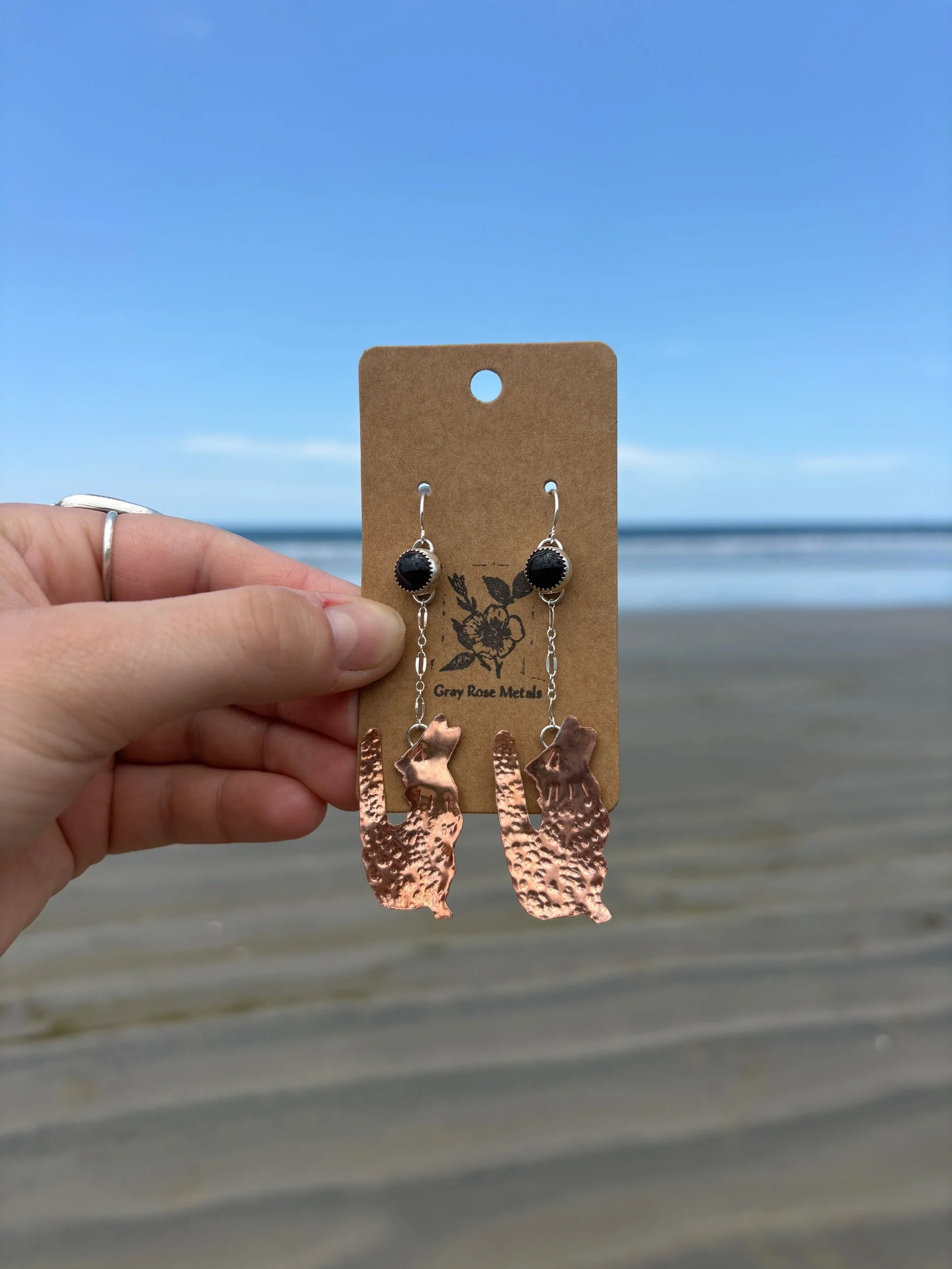 Image 1 of 1 Blue Lace Agate Wolf Moon Dangles $112.00 Made with sterling silver, copper, and natural blue lace agate Add To Cart Added! Made with sterling silver, copper, and natural blue lace agate