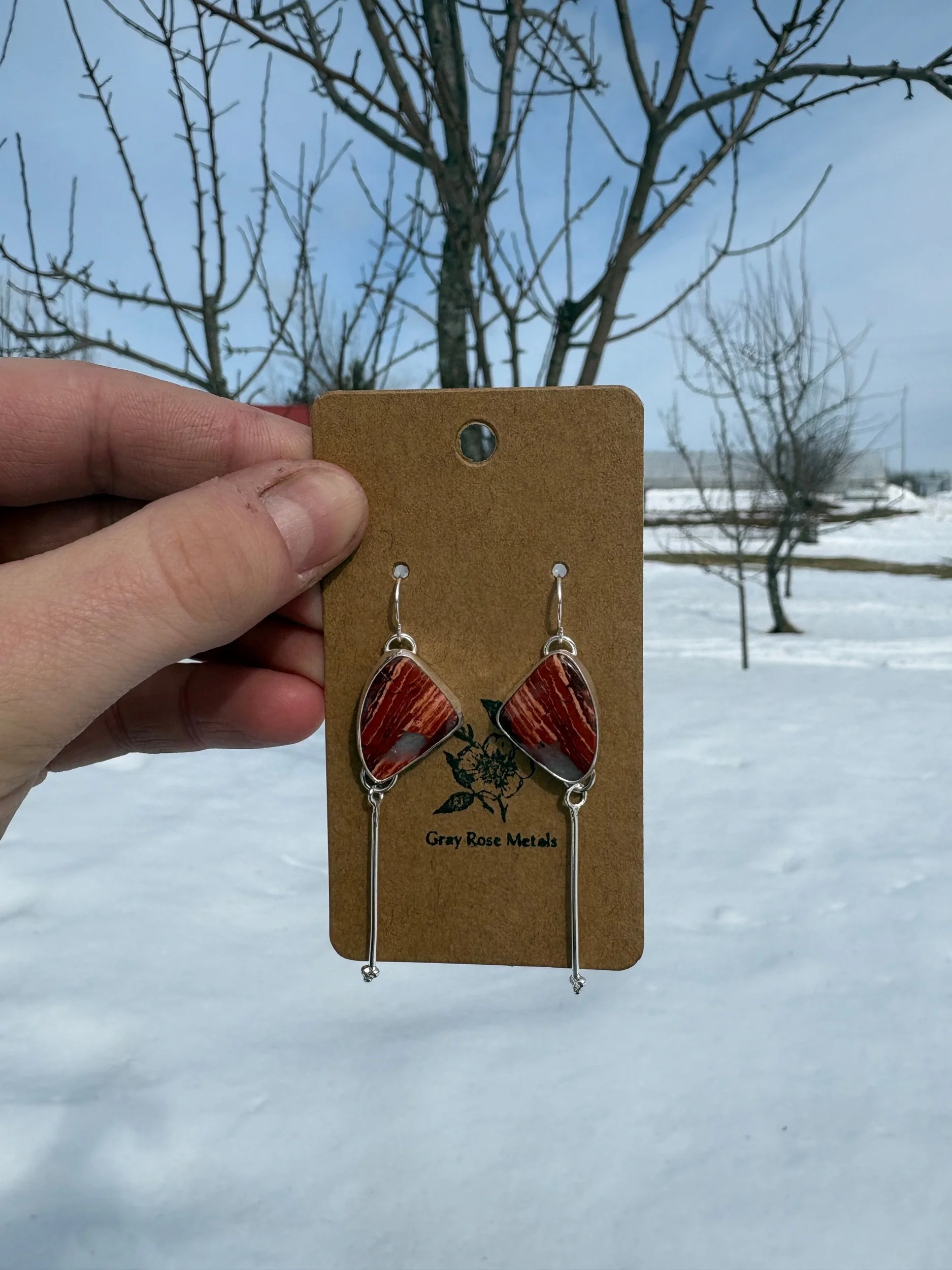 Image 1 of 1 Noreena Jasper Blossom Dangles $112.00 Made with sterling silver and natural noreena Jasper Add To Cart Added! Made with sterling silver and natural noreena Jasper