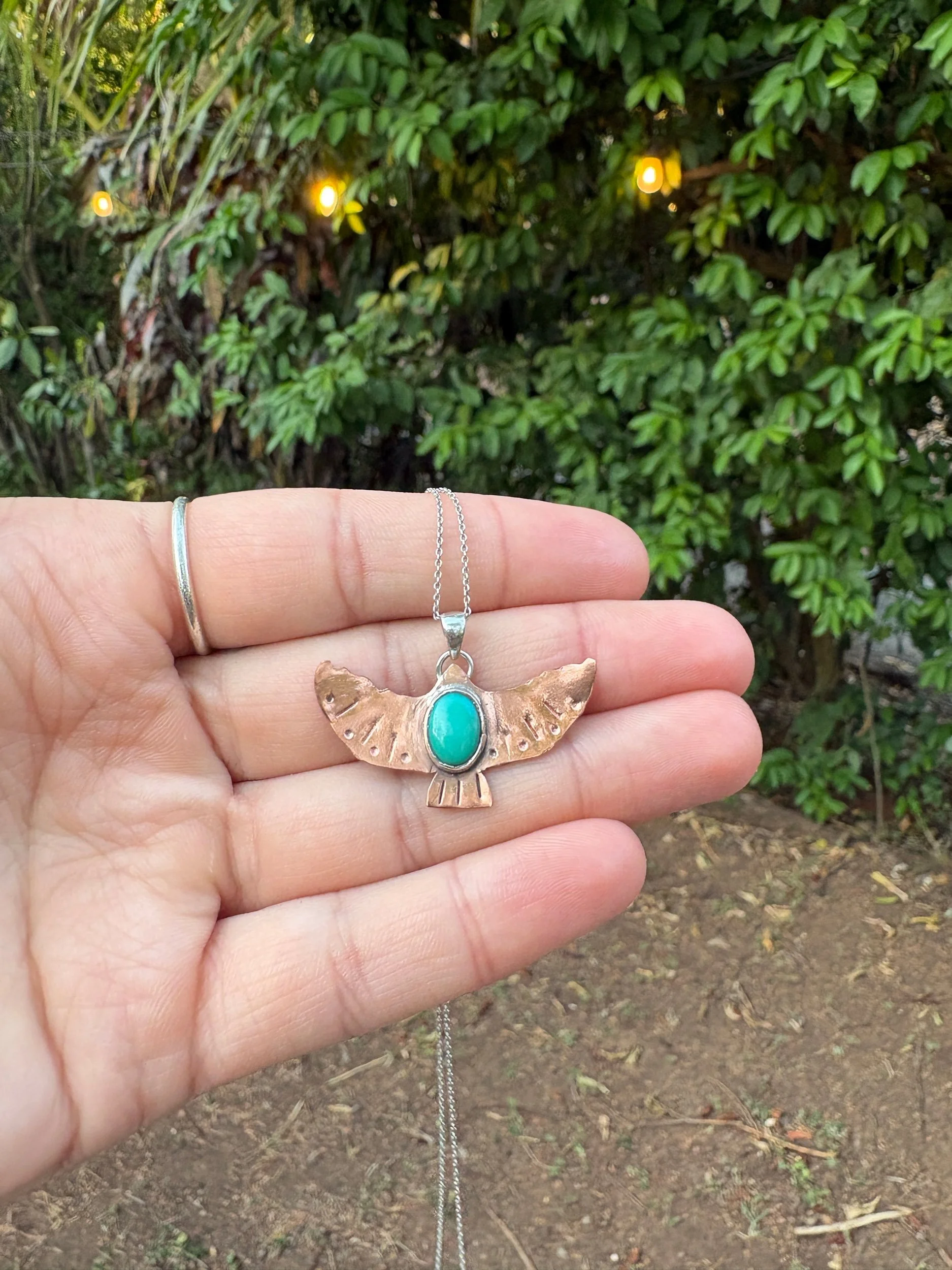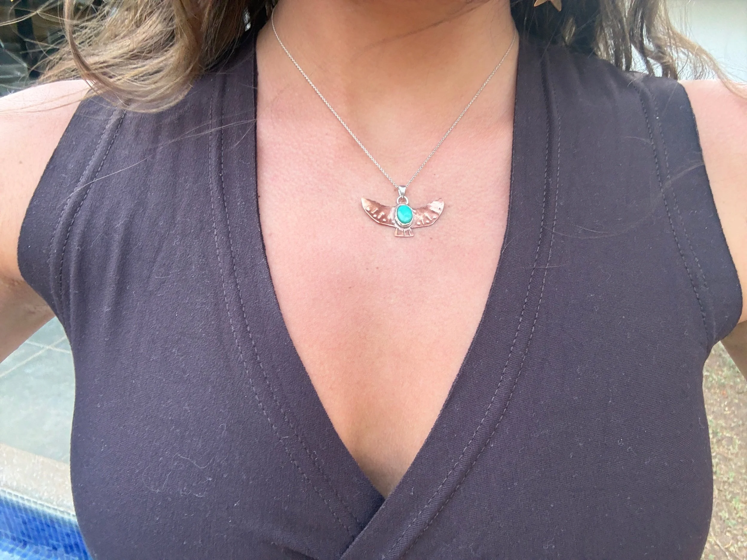 Image 1 of 2 Image 2 of 2 Turquoise Falcon Pendant $64.00 Handmade with sterling silver, copper, and natural turquoise Add To Cart Added! Handmade with sterling silver, copper, and natural turquoise