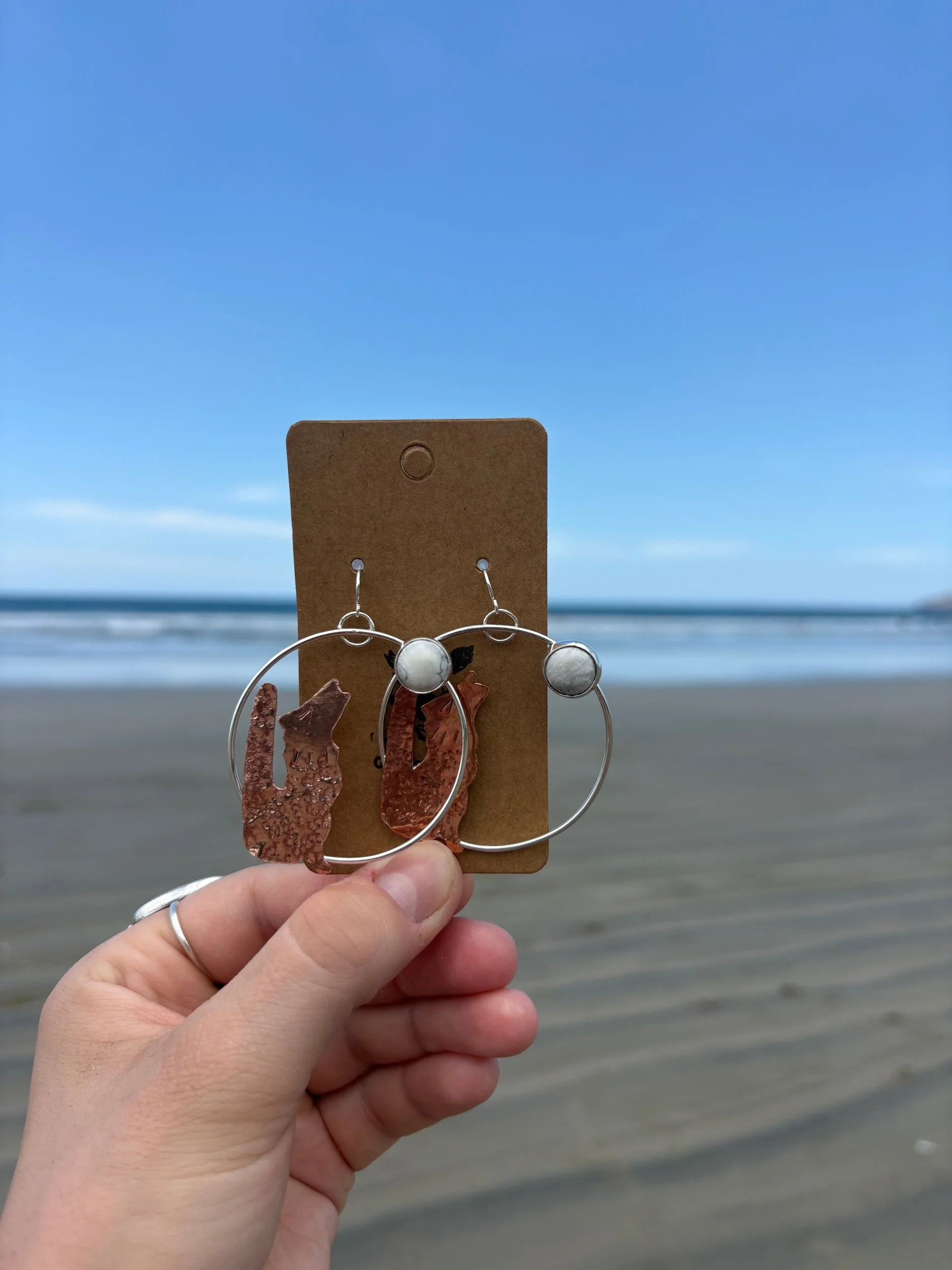 Image 1 of 1 Wolf Moon Dangles $112.00 Made with sterling silver, copper and natural Howlite stone🐺 Add To Cart Added! Made with sterling silver, copper and natural Howlite stone🐺